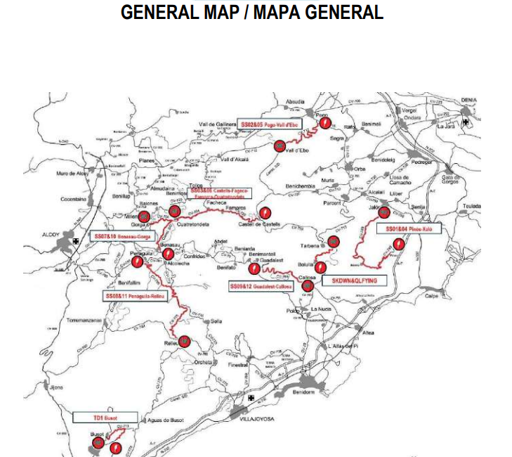 El rallye arrancará el jueves 6 de noviembre con el shakedown que se desarrollará en el tramo Bolulla-Tárbena. Al día siguiente, a primera hora de la tarde se disputa el TC-1 Pînos-Xaló (15,8 kilómetros), a partir de las 13,45 horas. A continuación se afrontará el Pego-Vall d’Ebo, de 10,6 kilómetros, y presente en el recorrido del año anterior. La tercera especial será el Castells-Famorca-Fageca-Quatretondeta, de 14,9 kilómetros, tras lo cual los participantes pasarán por las asistencias para proceder, a partir de las 20:01 horas, afrontar, de nuevo, estas mismas tres especiales, en un segundo bucle.