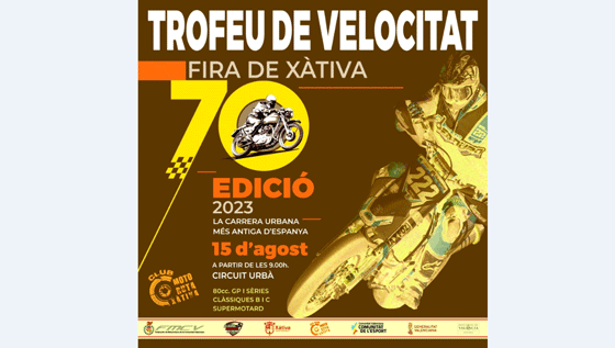 Las calles de Xàtiva acogen hoy la 70 edición del Trofeu de Velocitat Fira de Xàtiva, la carrera de motos urbana más antigua de España que se celebrará, como cada año, el 15 de agosto. Las categorías convocadas son: 80GP, 80 Pro Series, Clásicas y Supermotard no puntuable. Se han inscrito 74 pilotos. A las 8:30h empezarán las verificaciones y a las 9:30 será el briefing para dar comienzo a los entrenamientos libres, los cronometrados y las carreras. Alrededor de las 14:30h se hará la ceremonia de entrega de trofeos de todas las categorías.
