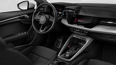 El habitáculo presenta novedades que van desde el diseño de la palanca de cambios y las salidas de aire, hasta las inserciones decorativas de tela y la nueva iluminación ambiental. La consola central rediseñada incorpora prácticos portavasos y un reposabrazos de serie. Sus costuras de contraste, al igual que las del cuadro de la instrumentación, son de doble pespunte, lo que imprime una clara personalidad racing. El interior de los modelos S3 presenta colores oscuros con algunos elementos plateados. El revestimiento negro del techo, los pedales de acero inoxidable, los umbrales de las puertas iluminados con inserciones de aluminio con el logotipo S y las molduras interiores con apariencia de aluminio acentúan el carácter deportivo del vehículo. El volante deportivo de cuero con tres radios, plano en su parte inferior, incorpora botones multifunción y nuevas levas cromadas. Los asientos deportivos con reposacabezas integrados y refuerzos laterales pronunciados proporcionan una mayor sujeción lateral.