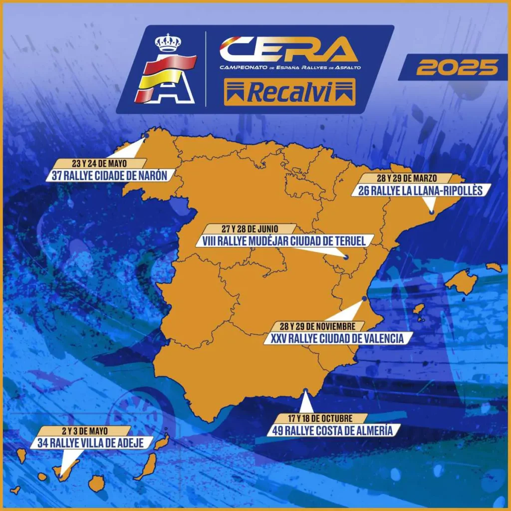 Mantienen su puntuabilidad para el renovado CERA-Recalvi (Campeonato de España de Rallyes de Asfalto) cuatro de las pruebas que ya formaron parte del certamen en 2024: el 26 Rallye La Llana-Ripollès, el 37 Rallye Cidade de Narón, el 34 Rallye Villa de Adeje y el VIII Rallye Mudéjar Ciudad de Teruel, con el que finalizó la temporada el pasado mes de diciembre.