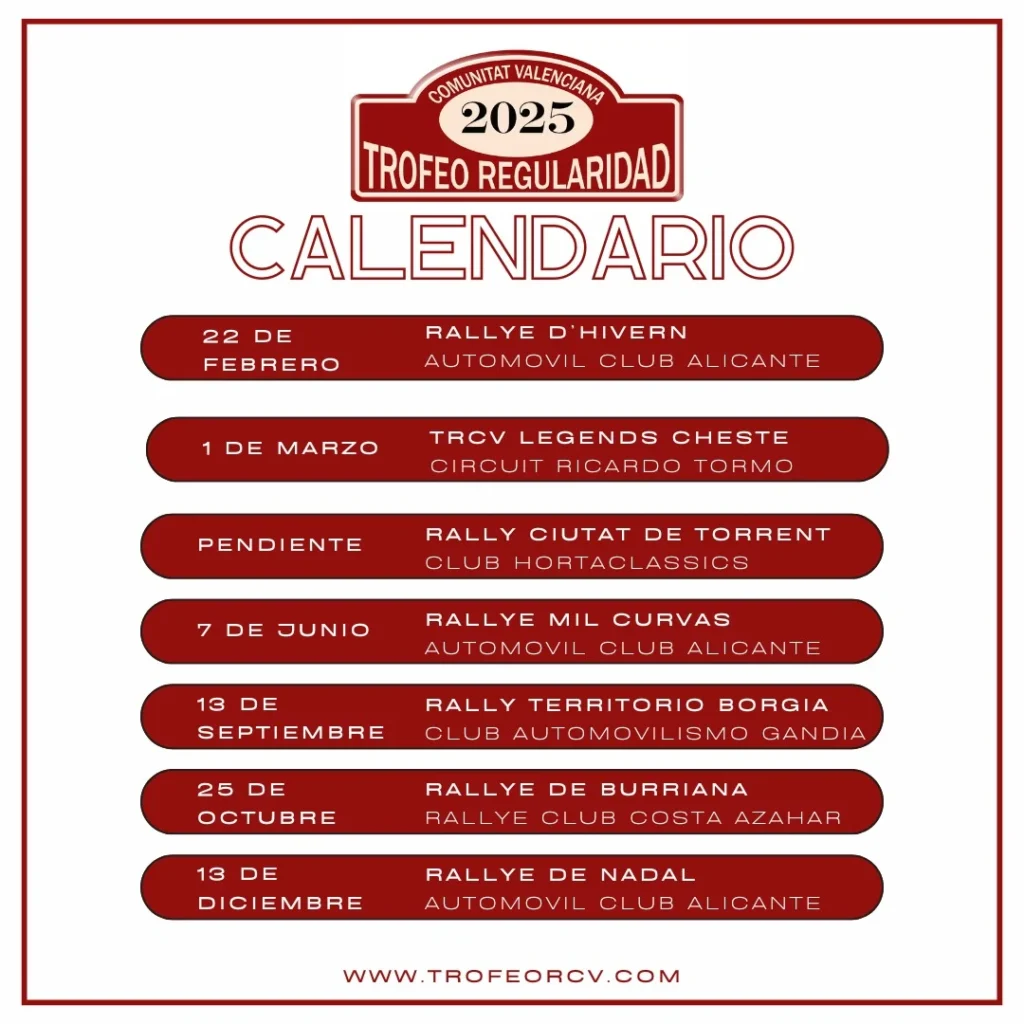 El calendario del Trofeo de Regularidad de la Comunidad Valenciana (TRCV) de 2025 contempla un total de 7 pruebas. El certamen se pondrá en marcha y finalizará con eventos organizados por el club decano del automovilismo autonómico valenciano, el Automóvil Club de Alicante (ACA). En menos de un mes, todo arrancará en tierras alicantinas con motivo del VII Rallye d´Hivern de San Vicent del Raspeig, prueba programada para el 22 de febrero. El TRCV 2025 concluirá con el V Rallye de Nadal de la turística localidad costera alicantina de El Campello, que tendrá lugar el 13 de diciembre. Entre medias, por cierto, el ACA también organizará, y nuevamente en tierras alicantinas, el XI Rallye Mil Curvas en Sant Joan d´Alacant, previsto para el 7 de junio.