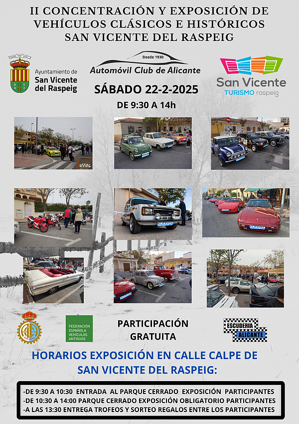 Junto a la prueba deportiva, el ACA también ha organizado la II Concentración y Exposición de Vehículos Clásicos e Históricos San Vicente del Raspeig. El evento, programado de 9:30h a 14h, también se desarrollará junto al Polideportivo Municipal (en la calle Calpe). La inscripción es gratuita y no es necesaria pre-inscripción. Habrá sorteo de regalos y trofeos. El organizador obsequiará con un almuerzo gratuito para los 100 primeros participantes que entren en la Concentración (un almuerzo por vehículo clásico o histórico de 2, 4 ó 6 ruedas).