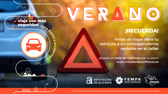 Como cada año, FEMPA emprende una campaña dirigida a los usuarios del automóvil y la motocicleta para su sensibilización sobre la seguridad vial con motivo de la operación salida de verano. Esta iniciativa, que cuenta con el apoyo de la Diputación de Alicante, incluye el diseño de un nuevo Cartel para que los talleres puedan avisar a sus clientes sobre la importancia de revisar sus vehículos antes de las vacaciones de verano, con el objetivo de evitar averías y garantizar un viaje seguro.