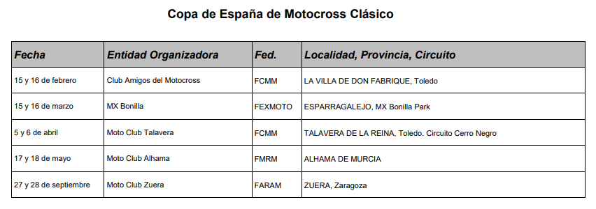 Uno de los certámenes más madrugadores, y que tiene el calendario mejor definido a fecha de hoy, es el de la Copa de España de Motocross Clásico. Verá la luz el fin de semana del 15 y 16 de febrero en la localidad toledana de La Villa de Don Fabrique.Tras otras tres carreras a disputar en Esparragalejo (Badajoz), Talavera de la Reina (Toledo) y Alhama de Murcia (Murcia), la Copa echará el telón los días 27 y 28 de septiembre en Zuera (Zaragoza).