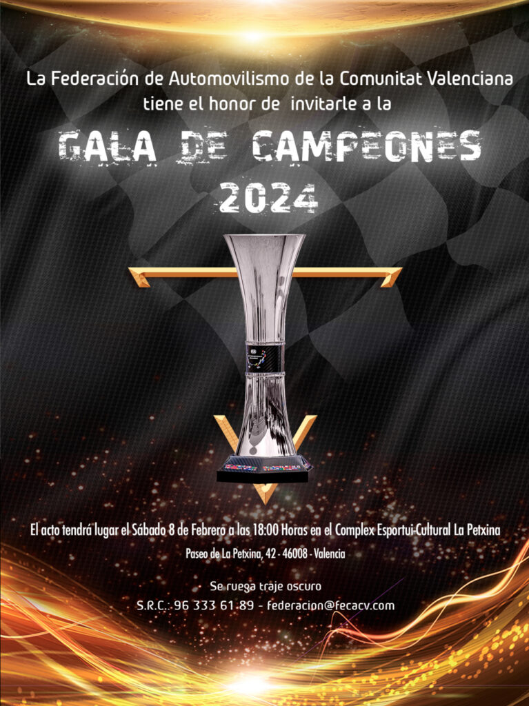 El sábado 8 de febrero de 2025, la Federación de Automovilismo de la Comunitat Valenciana (FACV) celebrará la Gala de Campeones de la temporada 2024 en la Fundación Deportiva Municipal de la Petxina (Valencia). El evento tendrá lugar a las 18 horas. La Federación solicita confirmación en el teléfono 96.333.61.89 o en el correo federacion,@fedacv.com