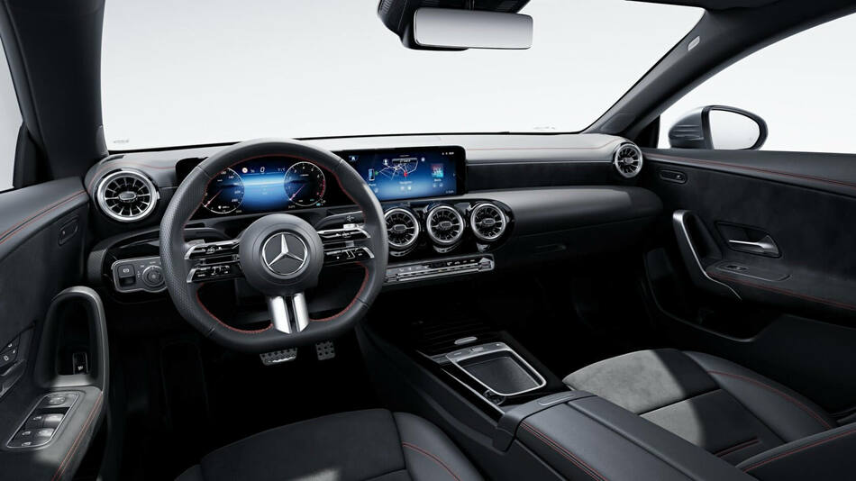 El interior de alta calidad con equipamiento deportivo y sistema de infoentretenimiento crea una unión estrecha y personal entre el usuario y la máquina. El conductor y el acompañante ocupan asientos deportivos con un contorno acentuado, que favorecen una posición activa gracias a su elevada sujeción lateral. El tapizado de serie en combinación de símil de cuero y microfibra de color negro es intemporal, e incluye algunos detalles típicos de AMG, como las costuras dobles de adorno AMG de color rojo. Los cinturones de seguridad designo de color rojo y el elemento de adorno del portainstrumentos en microfibra negro con ribetes de adorno rojos armonizan con este material. Otro elemento revalorizado por un anillo rojo son los difusores de ventilación cromados. La consola central en negro de alto brillo con panel táctil de serie incluye un elemento de mando adicional con interruptores para manejar el ESP de 3 niveles, el modo manual del cambio y la amortiguación adaptativa regulable opcional. La combinación de diseño deportivo y detalles sofisticados se refleja también en el sistema de infoentretenimiento con su innovador concepto de manejo y visualizado.